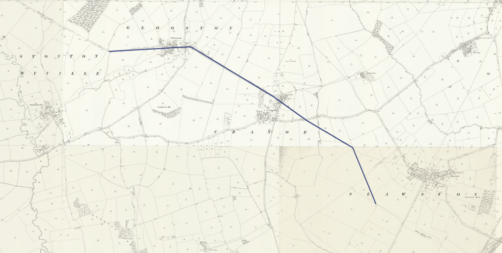 - Reynolds identified a diversion in his sketch map (1794) which seems to follow the current Cranoe Road Glooston / Church Hill Road Cranoe road. His route is not a road created during enclosure, because that didn’t happen until 1828. Perhaps the later enclosure road, which certainly seems to sit high in the landscape on a possible agger, followed the disused trackway.